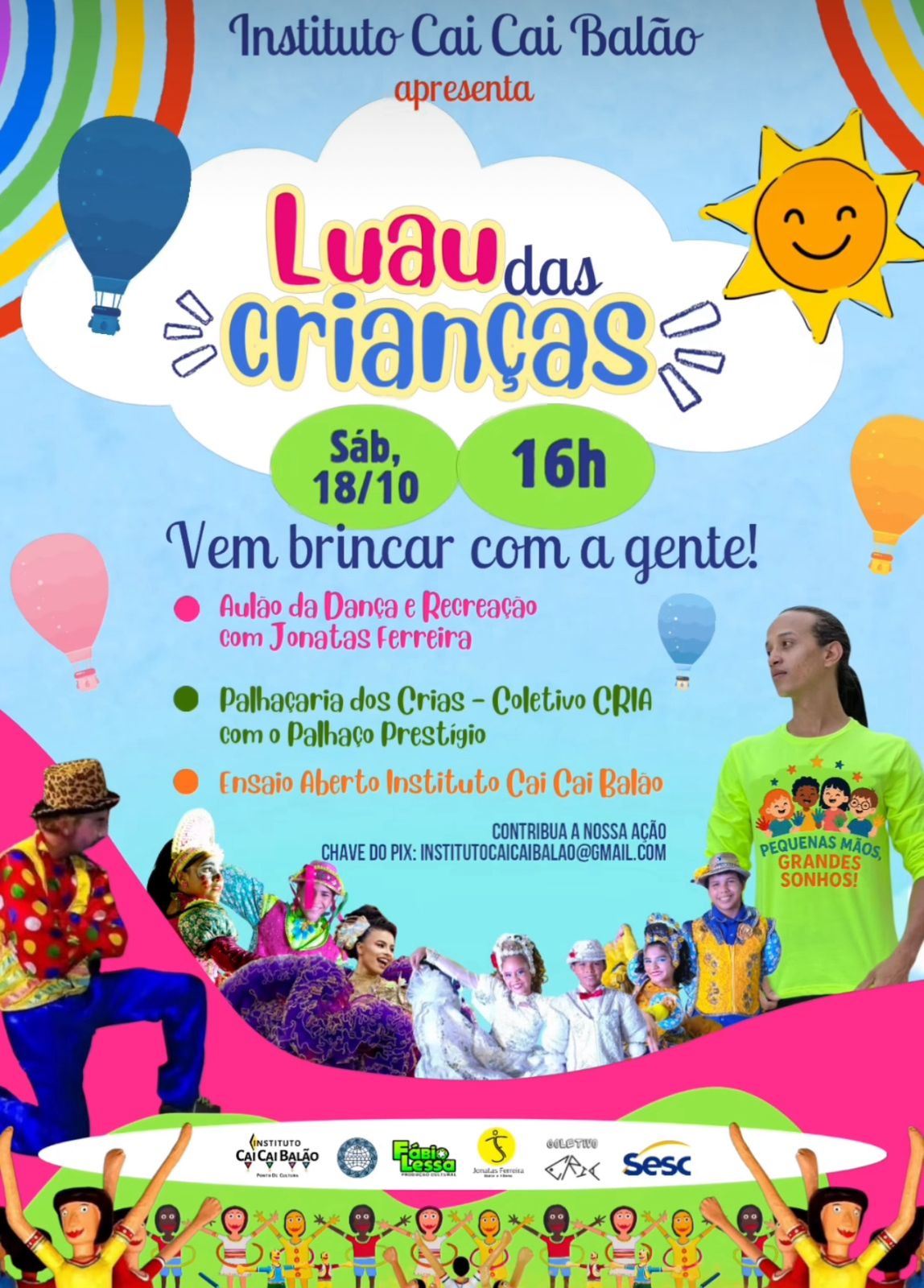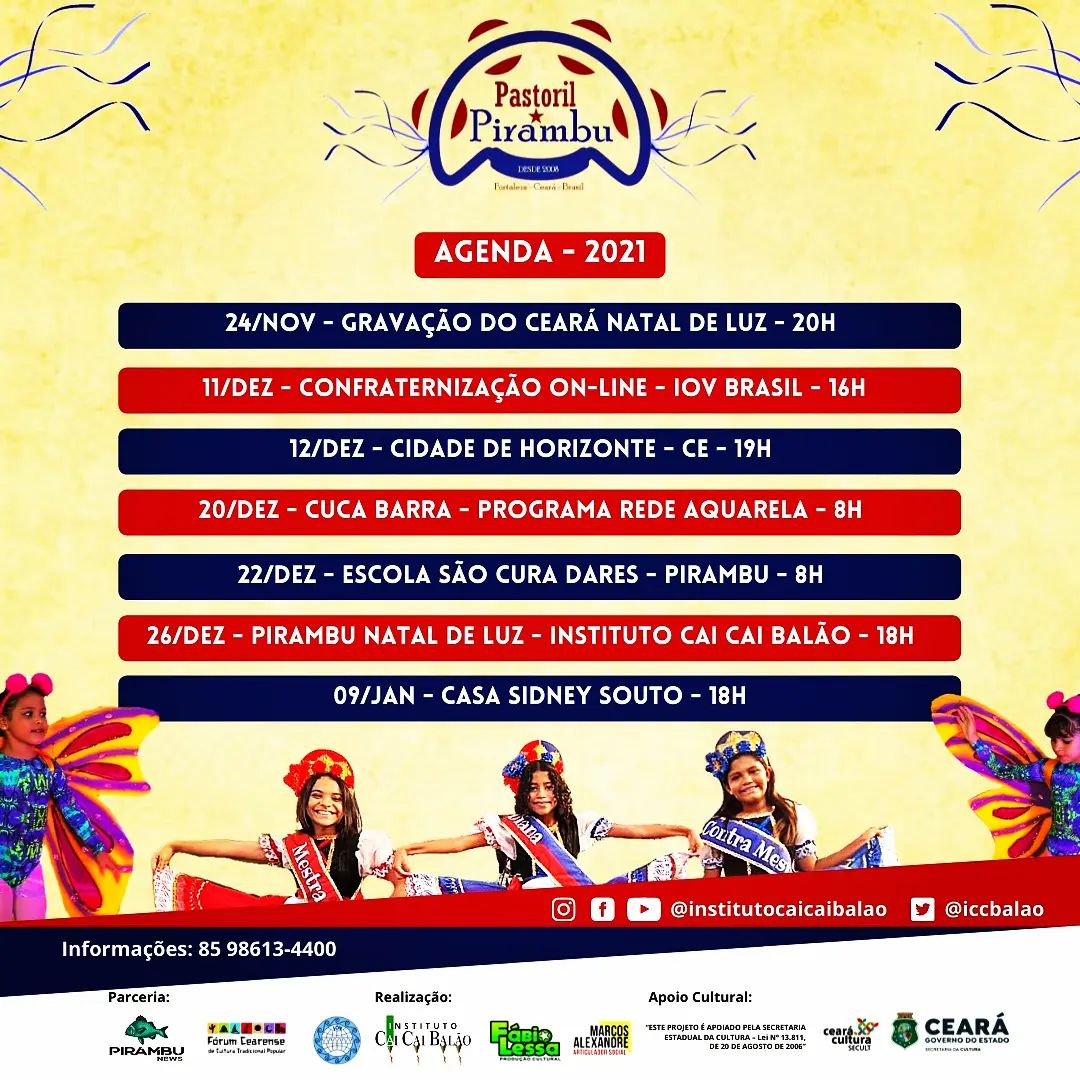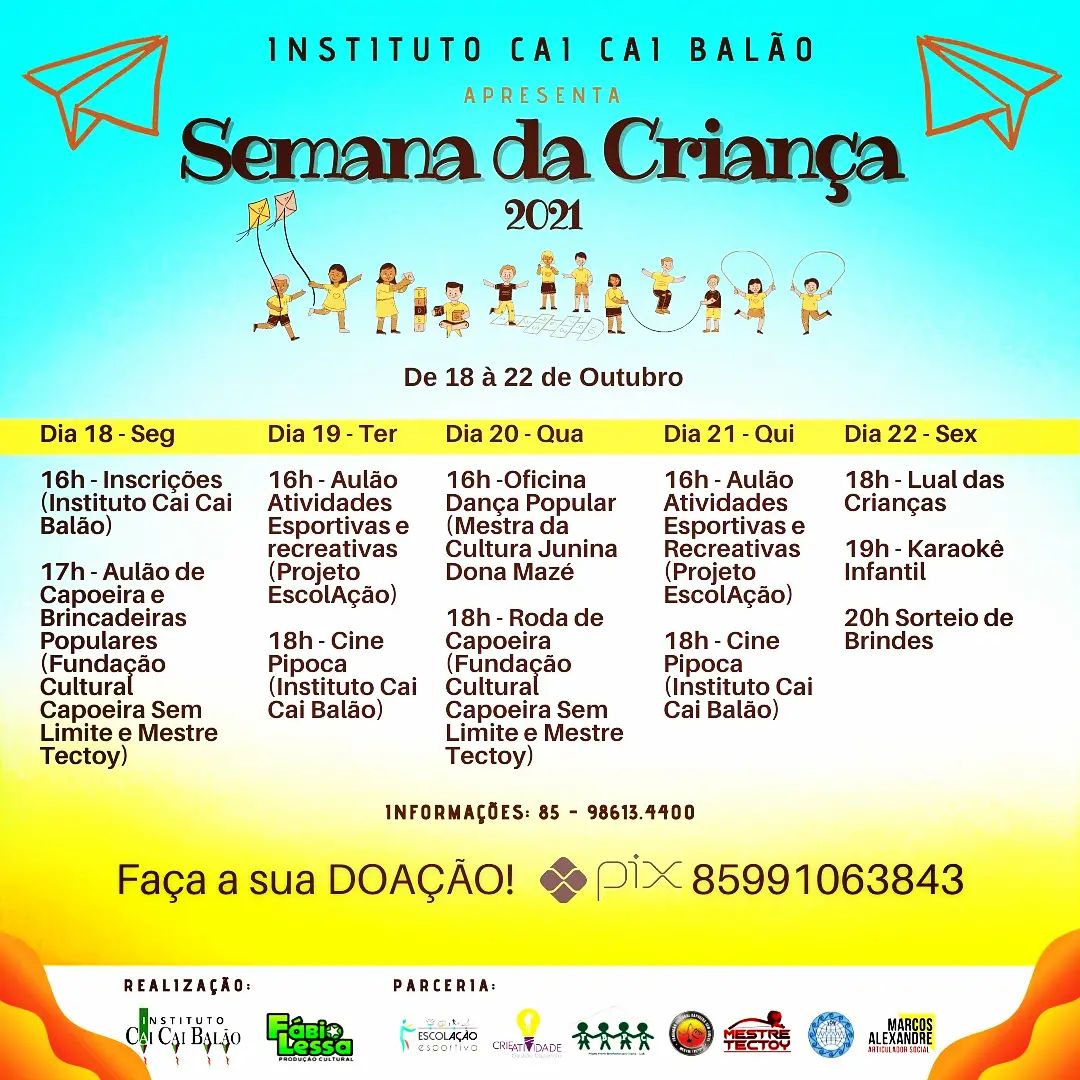 O Instituto Cai Cai Balão nasce em 2003 movido por um sonho coletivo: preservar, fortalecer e difundir a cultura popular brasileira, especialmente no Grande Pirambu, uma das maiores e mais potentes comunidades de Fortaleza-CE. Desde sua origem, o Instituto carrega o compromisso com a formação artística, o resgate das tradições e a inclusão social de crianças e adolescentes, transformando vidas por meio da arte.Sua criação está diretamente conectada à história da Quadrilha Junina Infantil Cai Cai Balão, que desde 1980 encanta o Brasil com apresentações vibrantes, autênticas e carregadas de emoção. Muito além de uma manifestação cultural sazonal, a quadrilha sempre foi um espaço de aprendizado, acolhimento, arte e cidadania para inúmeras crianças do Pirambu, muitas delas em situação de vulnerabilidade social.