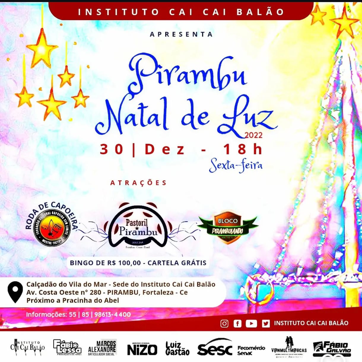 Hoje, o Instituto segue inovando, ampliando suas atividades e construindo novas parcerias para garantir que a cultura seja um direito de todos. Com o olhar voltado para o futuro, mas com os pés firmes na tradição, o Cai Cai Balão continua iluminando vidas, multiplicando oportunidades e escrevendo sua história como um dos mais importantes espaços culturais do Ceará.