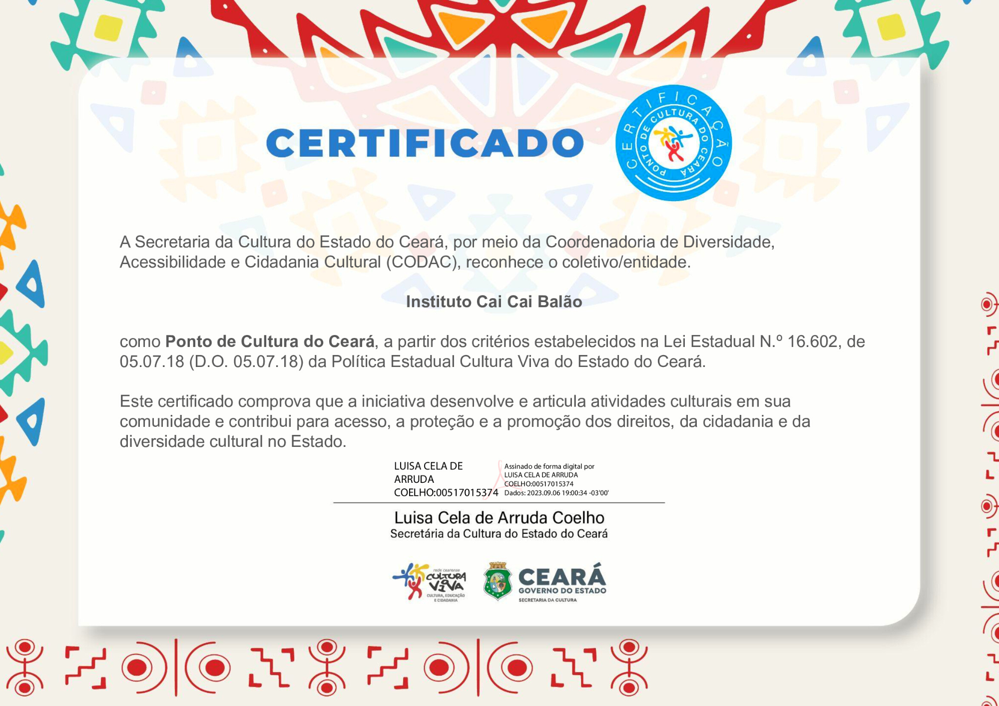 A trajetória do Instituto Cai Cai Balão foi reconhecida oficialmente com o título de Ponto de Cultura do Estado do Ceará, concedido pela Coordenadoria de Diversidade, Acessibilidade e Cidadania Cultural, conforme a Lei Estadual nº 16.602/2018, da Política Estadual Cultura Viva.