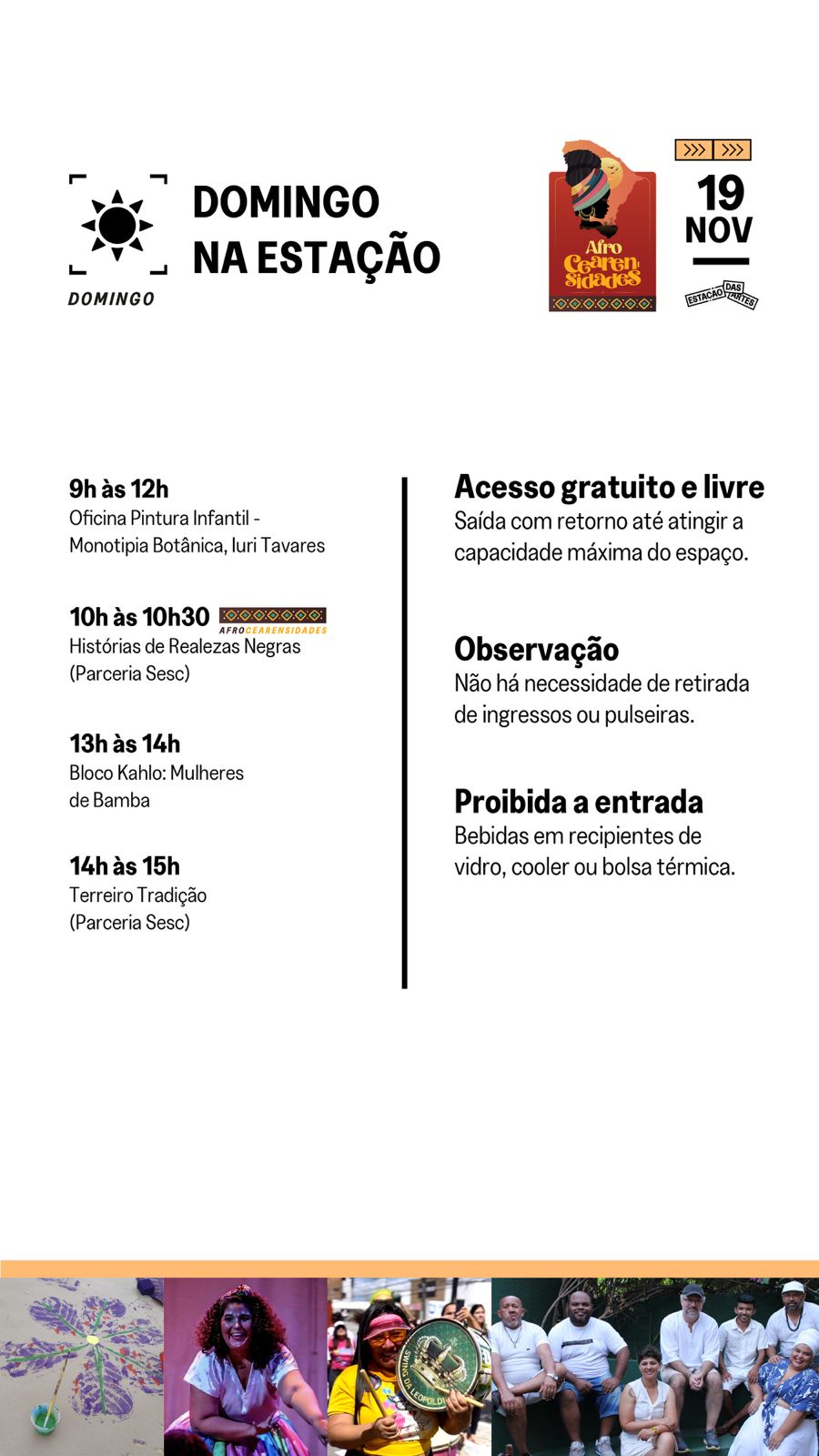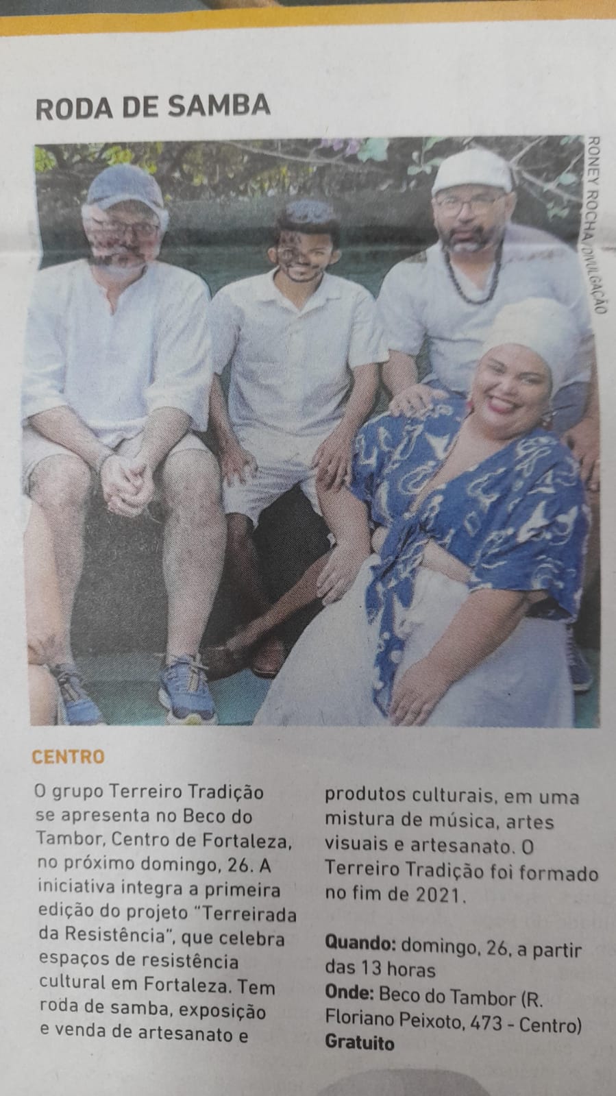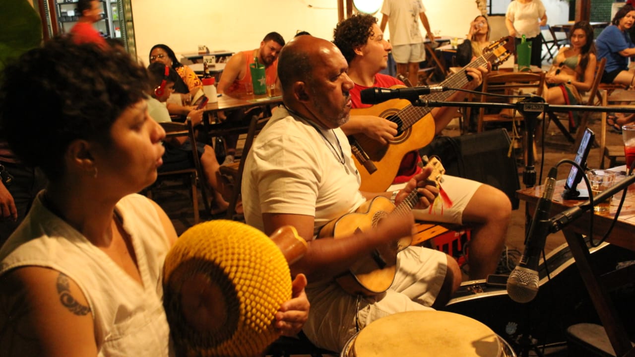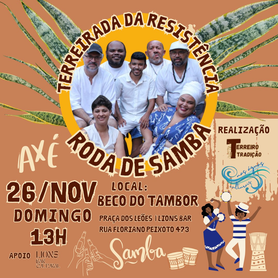 Roda de samba que dialoga com o repertório tradicional dos grandes mestres do samba e com as matrizes afro-brasileiras da nossa música. Uma apresentação que combina a energia do samba com a energia ancestral dos nossos terreiros.O grupo é formado por Chico do Cavaco, Tiago Silva (percussão), Sandro da Cuíca, Flávia Soledade (percussão), Felipe Araújo (surdo e voz),Ecinho Ponce (pandeiro), David Gouveia (violão), .Galeria