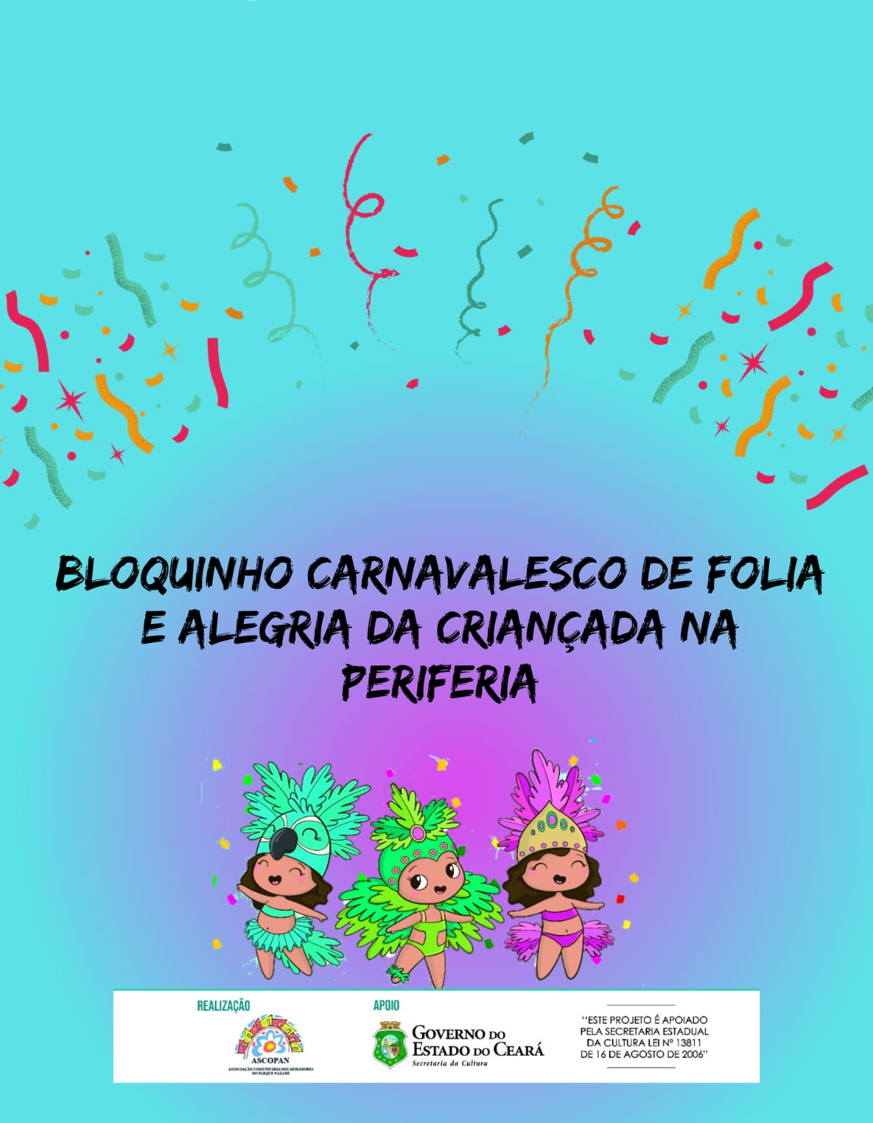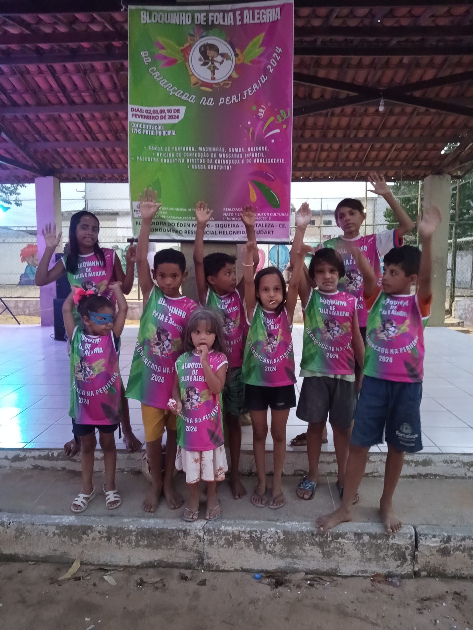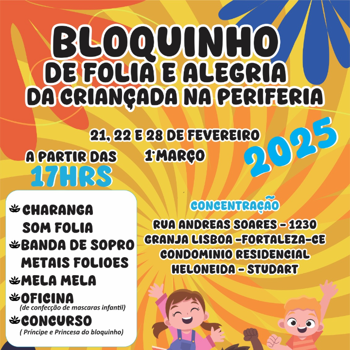 O BLOQUINHO CARNAVALESCO DE FOLIA E ALEGRIA DA CRIANÇADA NA PERIFERIA, COM SEDE NA GRANJA LISBOA, REALIZA SUAS SAÍDAS NO PRÉ CARNAVAL DE RUA EM FORTALEZA, UNINDO 200 CRIANÇAS E ADOLESCENTES, EM FESTIVIDADE AO CICLO CARNAVALESCO CEARENSE, COM MUITAS BRINCADEIRAS, PARA OS PEQUENOS FOLIÕES CURTIREM O CARNAVAL.ONDE ACONTECEU SUA PRIMEIRA EDIÇÃO NO PRÉ CARNAVAL DE 2020.