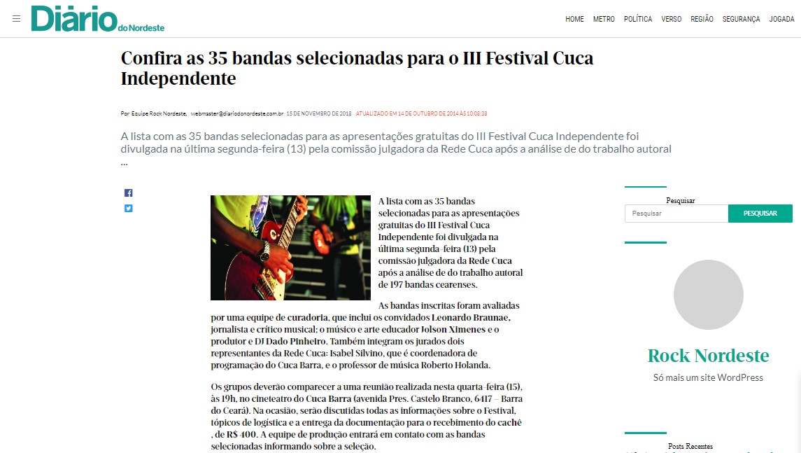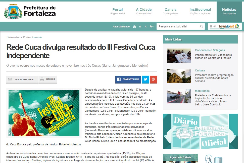 2014 - Parecerista da comissão de seleção do III Festival Cuca Independente, promovido pelo Cuca Barra – Prefeitura Municipal de Fortaleza.