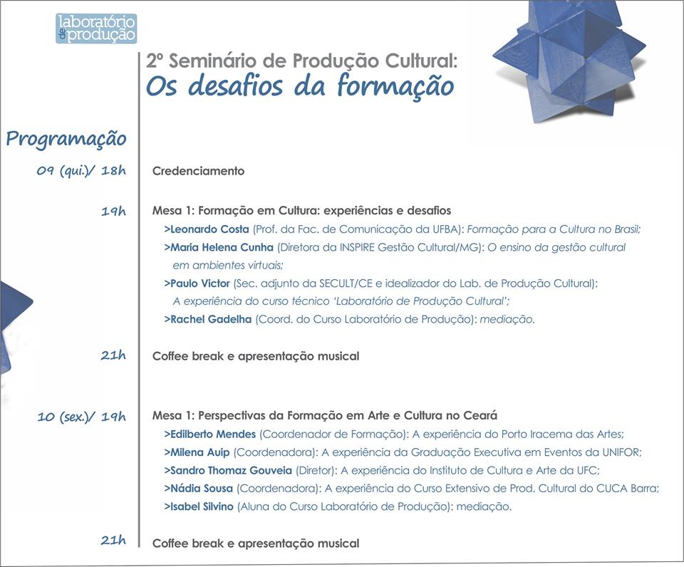 2017 - "Produção de Eventos Artísticos" nos Laboratórios Técnicos do Projeto Jardim de Gente. Realização: Centro Cultural Grande Bom Jardim (100h/a)