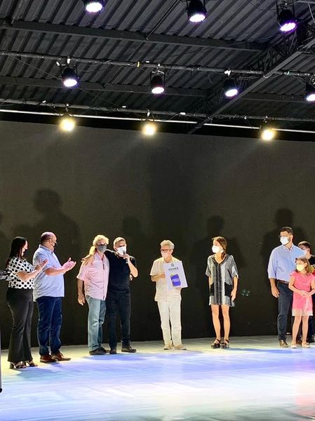 Teatro ao ar livre com palco coberto e plateia para cerca de 400 pessoas.