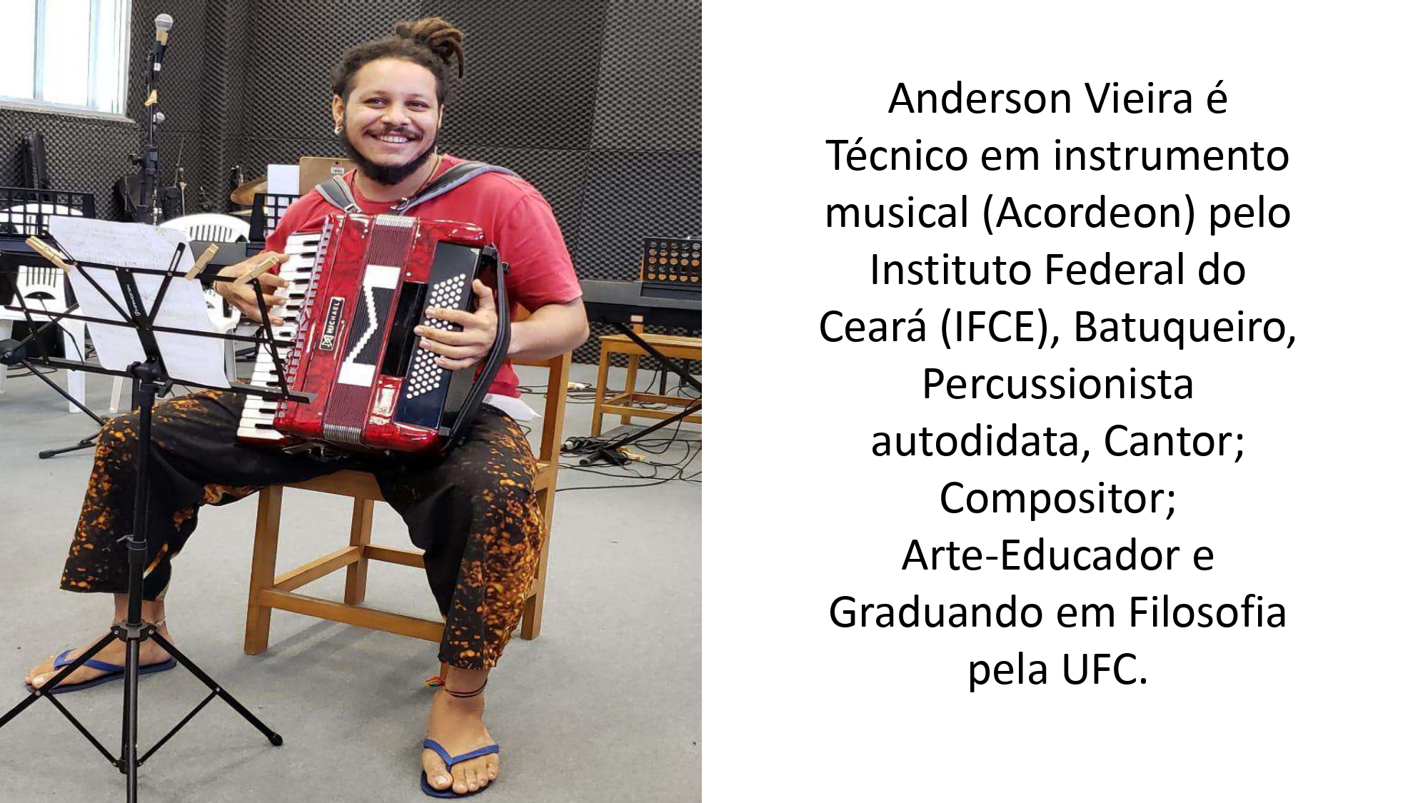 Como educador, desenvolve oficinas de percussão e cultura popular em comunidades e escolas públicas, acreditando na arte como ferramenta de formação, identidade e libertação. Sua pesquisa propõe um diálogo entre filosofia, oralidade e saberes de terreiro, compreendendo que o pensamento também pulsa no ritmo do tambor e nas memórias coletivas transmitidas pelos mais velhos.