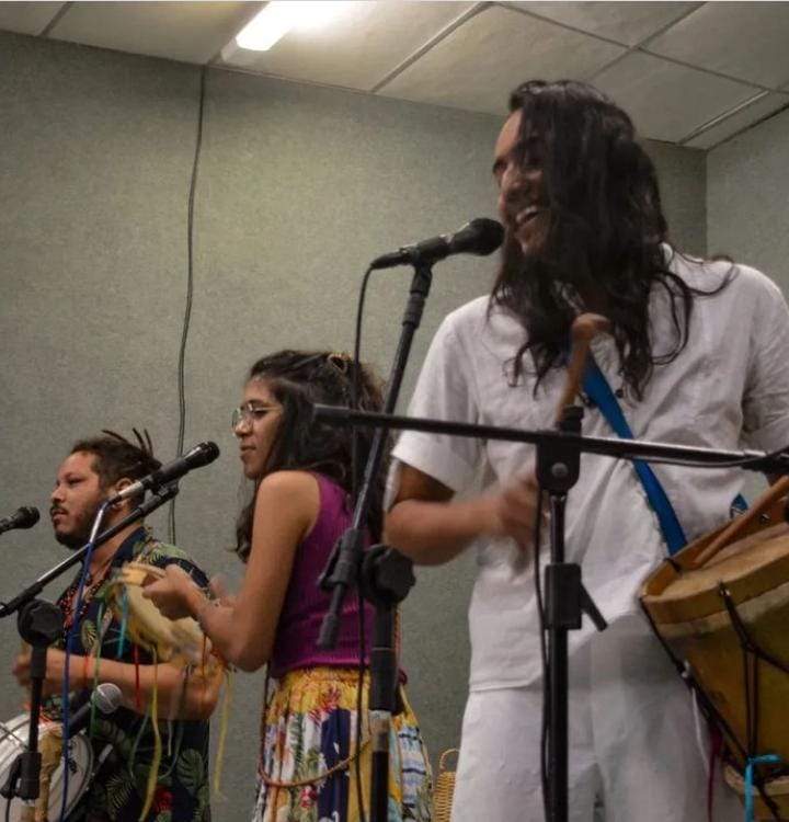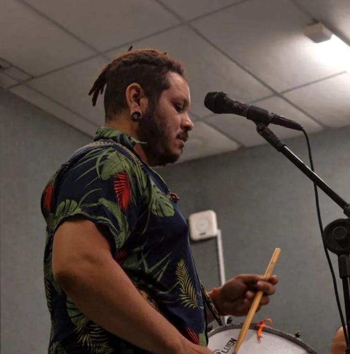 Caboco Maribé é artista, batuqueiro, cantor, compositor, arte-educador e pesquisador das tradições populares do Nordeste. Recebeu o nome artístico de um Mestre Juremeiro de Pau d’ Alho–PE e se reconhece como filho do tambor, aprendiz da rua e da roda — corpo em movimento guiado pela força dos ancestrais que fizeram da música um caminho de cura, resistência e comunhão. Técnico em Instrumento Musical (Acordeon) pelo IFCE e graduando em Filosofia pela UFC, une o saber acadêmico à oralidade e à prática comunitária, construindo pontes entre arte, espiritualidade e pensamento decolonial. Sua trajetória nasce da escuta, das festas de maracatu e dos cocos que atravessam o tempo como rios de memória.Desde 2016, integra o Coletivo Raízes do Griô e o Brinquedo de Rua, participando de processos formativos e ações voltadas ao fortalecimento da cultura popular como instrumento de transformação e pertencimento. Atua também na banda Banzo Beat — que mistura afrobeat, samba, candomblé e jazz em uma linguagem musical contemporânea e política — e no Coco da Dona Geralda, grupo que honra a memória da mestra curandeira de Tururu (CE) e afirma o coco como linguagem de resistência, espiritualidade e ancestralidade viva.