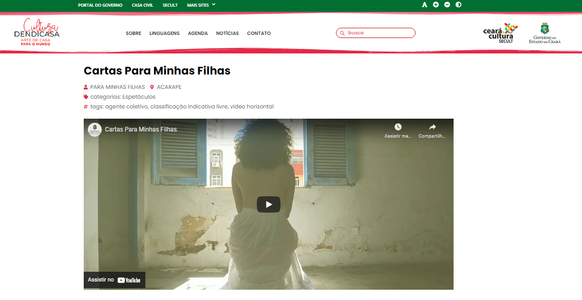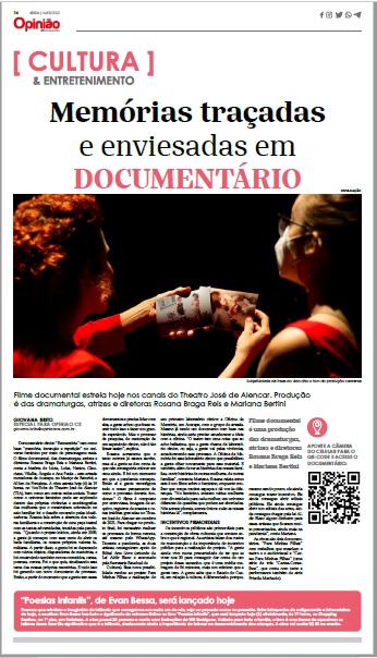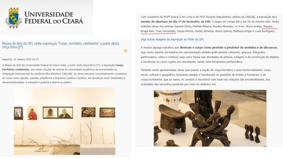 ROSANA BRAGA REIS (Natural de Fortaleza-CE, 35 anos) é artista do teatro e do audiovisual, Jornalista formada na UFC e Mestra em Artes pelo Programa de Pós-Graduação em Artes da Universidade Federal do Ceará (PPGArtes/UFC). Também é servidora Técnica Administrativa em Educação pela Universidade da Integração Internacional da Lusofonia Afro-brasileira (Unilab). Brinca no Maracatu Solar. Em suas pesquisas em artes, se interessa por cartas, documentos e documentários, e pelas poéticas do corpo, da palavra, da presença e da ausência