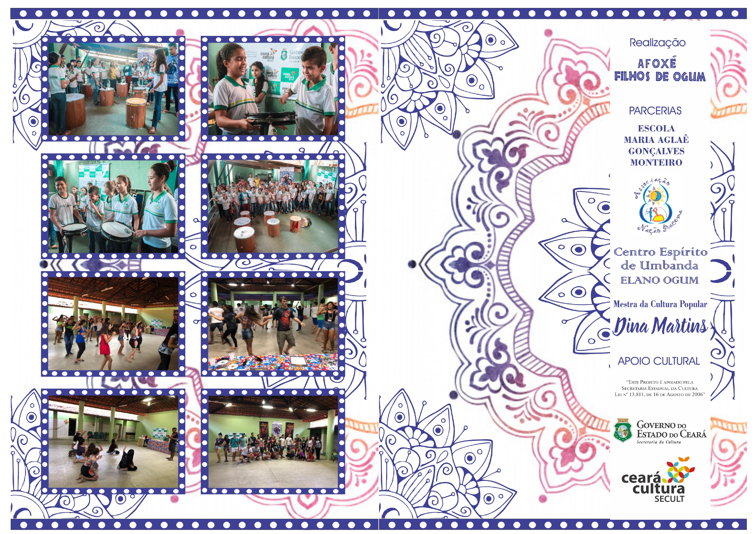 DURANTE O ANO REALIZAMOS JUNTO AS AESCOLAS MUNICIPAIS DE CANINDÉ OFICINAS DE DANÇA, OFICINAS DE BATUQUE, PALESTRAS E VISITAS GUIADAS AO CENTRO ESPIRITO DE UMBANDA ELANO DE OGUM.