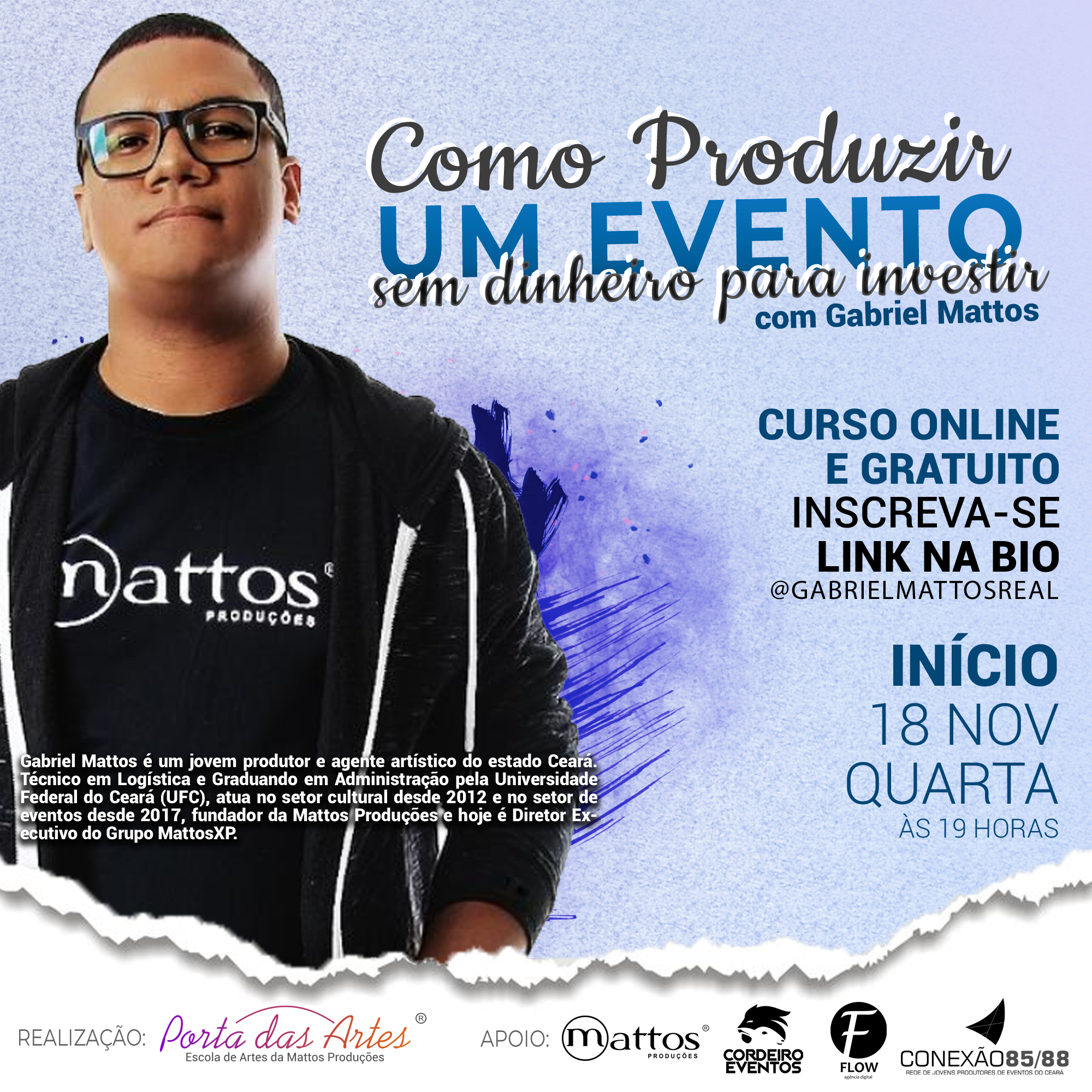 Gabriel Mattos é eleito Conselheiro Estadual de Políticas Culturais do Ceará, pela 2ª vez, e ex-Conselheiro Municipal de Políticas Culturais de Fortaleza. Com mais de 13 anos de experiência no setor cultural, é empresário e, como Diretor da Mattos Produções e Diretor-Presidente do Instituto Pode Mais, atua em diversas cidades do estado, destacando-se por promover a inclusão e diversidade por meio da arte e cultura das favelas. Técnico em Logística e graduando em Administração, possui expertise em políticas públicas e orçamento público, além de acreditação técnica para consultoria em fomento cultural. Vencedor de prêmios como Aqui Tem Juventude da Secretaria de Juventude de Fortaleza (2022), finalista do Prêmio Jovens Visionários da Prudential do Brasil no Rio de Janeiro (2023), é uma das lideranças negras nacionais financiadas pela Plataforma Alas da Fundação Tide Setúbal, de São Paulo.Gabriel Mattos é eleito Conselheiro Estadual de Políticas Culturais do Ceará, Ex-Conselheiro Municipal de Políticas Culturais de Fortaleza, Gestor Cultural, Produtor Cultural e Agente Artístico, residente em Fortaleza e com atuação em diversas cidades do estado do Ceará. Técnico em Logística pela SEDUC-CE e Graduando em Administração pela Universidade Federal do Ceará (UFC), possui cursos nas áreas de políticas públicas e orçamento público, certificados pelo Instituto Legislativo Brasileiro e pela Escola Nacional de Administração Pública. Atuação com enfoque no monitoramento do orçamento público para cultura e direitos humanos. Possui Selo de Acreditação Técnica para Consultoria e Assessoria em Fomento Cultural, emitido pelo Instituto Mirante de Cultura e Arte em parceria com a Secretaria da Cultura do Estado do Ceará e Instituto Brasileiro de Direitos Culturais.