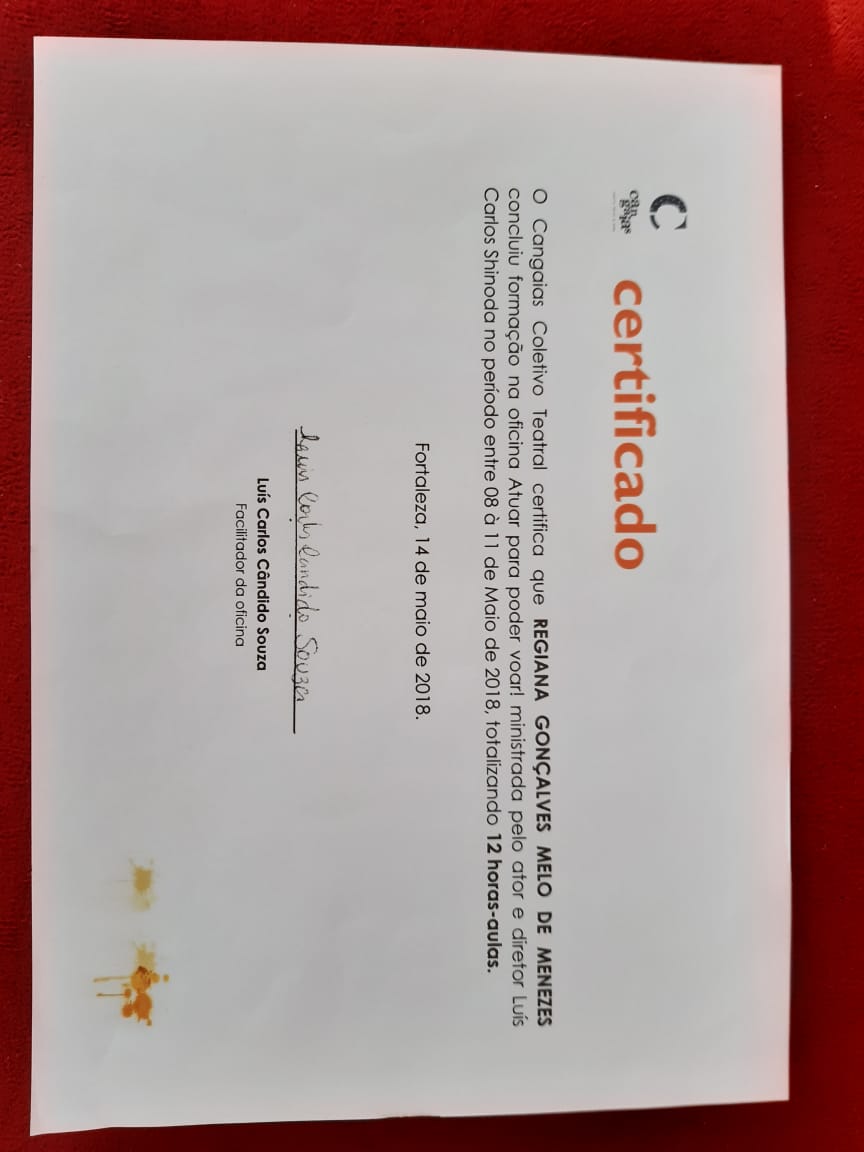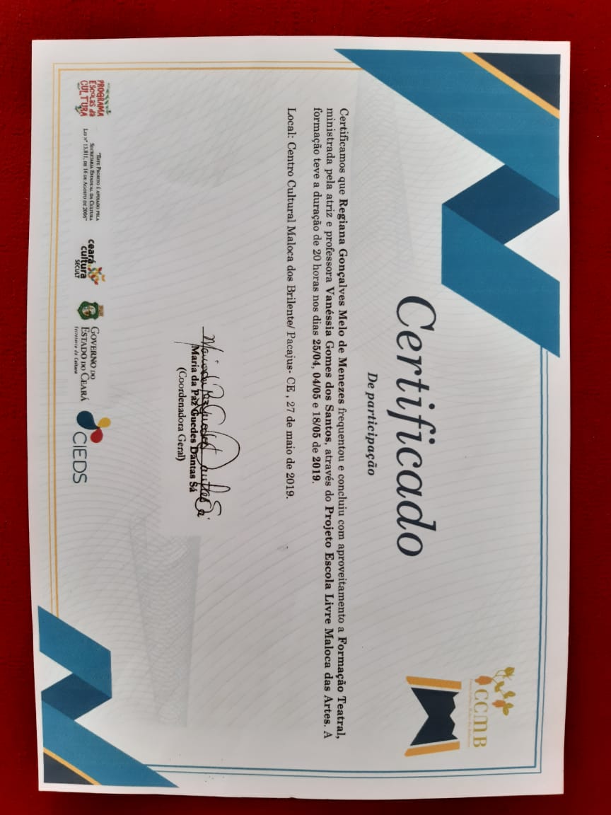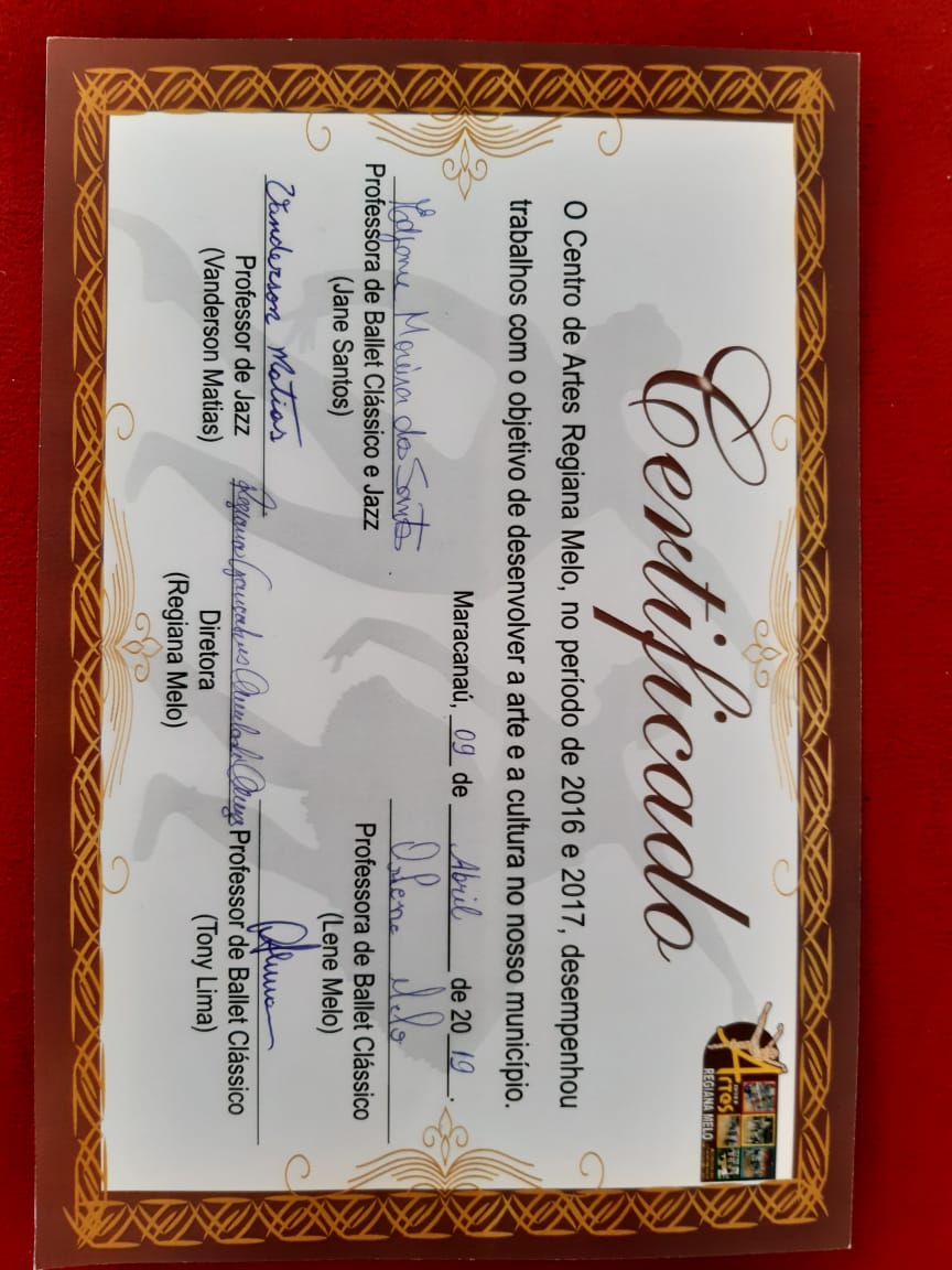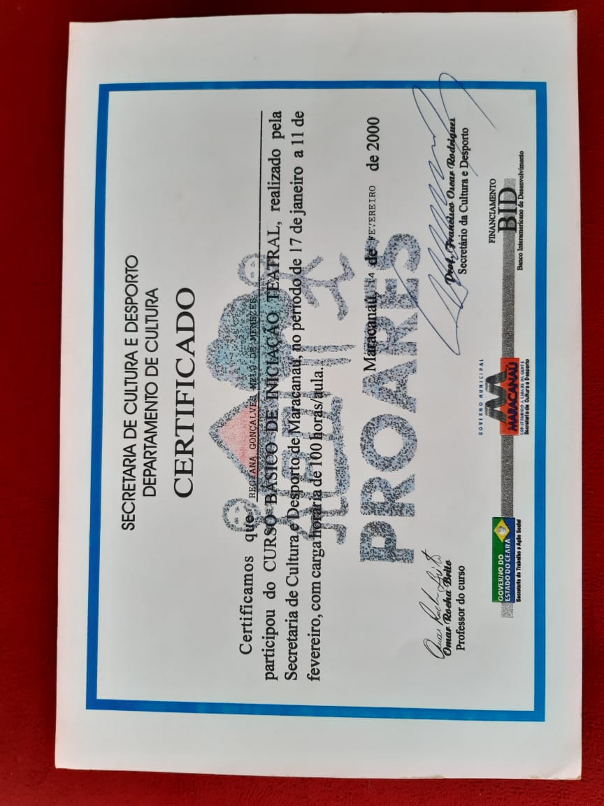 Formada em Pedagogia e Licenciada no Curso de Licenciatura em Português pela Universidade Estadual Vale do Acaraú. Especialização em Língua Portuguesa pela Universidade Estadual Vale do Acaraú e Especialização em andamento de Arte em Educação com Ênfase em Teatro pela Universidade Vale do Jaguaribe. Certificado de Ballet Clássico pela a Escola de Dança Arte e Movimento de Maracanaú-Ce. Certificados de trabalhos desenvolvidos na área de arte e cultura no município de Maracanaú. Certificado de Curso Básico de Iniciação Teatral pelo Proares- Secretaria de Cultura e Desporto de Maracanaú. Certificado da Oficina atuar para poder voar Cangais Coletivo Teatral. Certificado Formação Teatral Projeto Escola Livre Maloca das Artes Pacajus- Ce. Certificado da Oficina de Interpretação Teatral Programa Funarte de Capacitação Artística e Técnica em Artes Porto Iracema das Artes. Certificado da Oficina de Danças Populares Boi do Quilombo Secretaria de Cultura e Turismo de Maracanaú. Certificado do Curso de Reisado Instituto Garajal de Arte e Cultura Popular. Certificado do Curso O entorno e a microempresa central de microcrédito do Nordeste.Vídeos