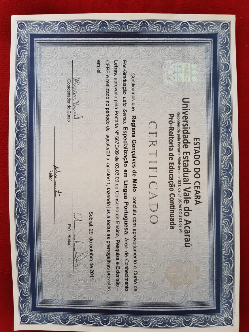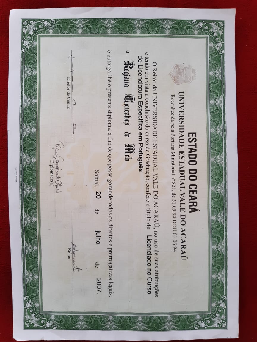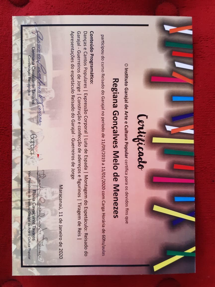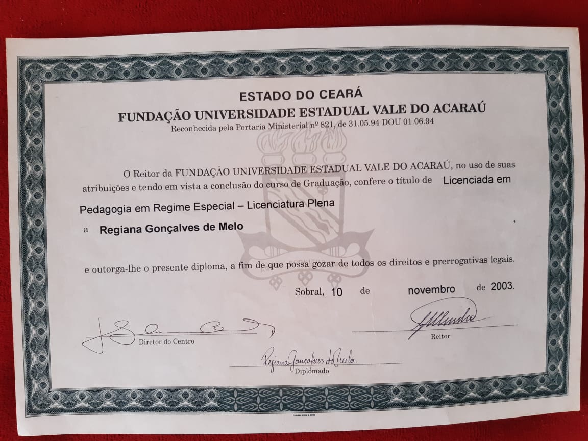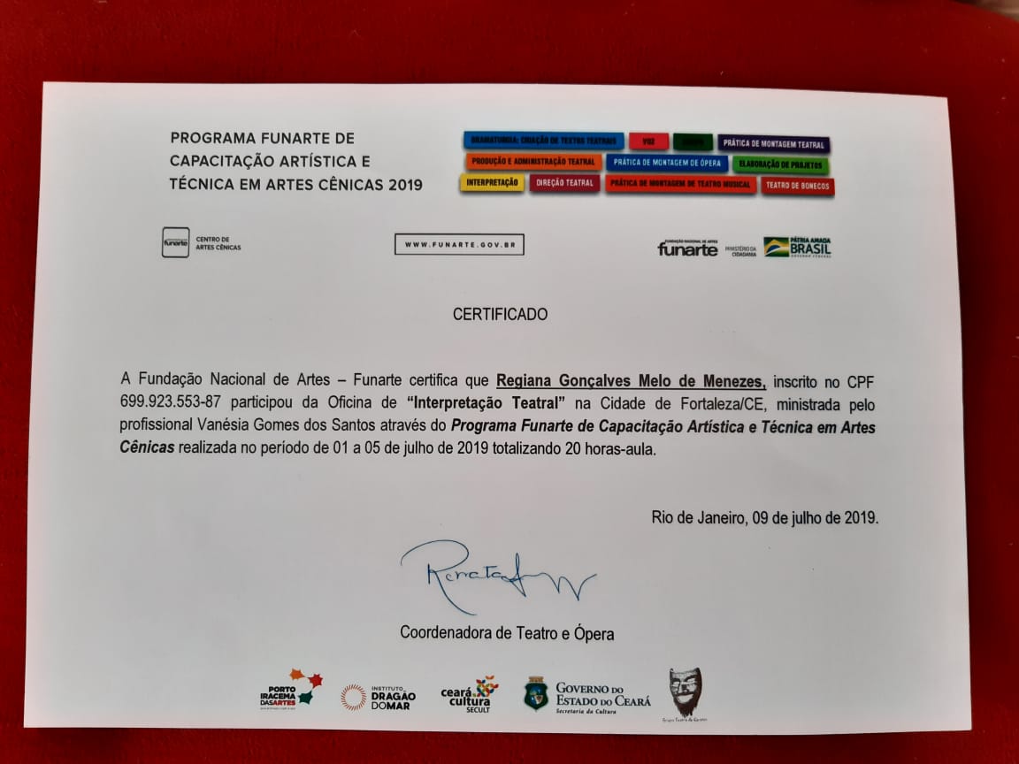 Formada em Pedagogia e Licenciada no Curso de Licenciatura em Português pela Universidade Estadual Vale do Acaraú. Especialização em Língua Portuguesa pela Universidade Estadual Vale do Acaraú e Especialização em andamento de Arte em Educação com Ênfase em Teatro pela Universidade Vale do Jaguaribe. Certificado de Ballet Clássico pela a Escola de Dança Arte e Movimento de Maracanaú-Ce. Certificados de trabalhos desenvolvidos na área de arte e cultura no município de Maracanaú. Certificado de Curso Básico de Iniciação Teatral pelo Proares- Secretaria de Cultura e Desporto de Maracanaú. Certificado da Oficina atuar para poder voar Cangais Coletivo Teatral. Certificado Formação Teatral Projeto Escola Livre Maloca das Artes Pacajus- Ce. Certificado da Oficina de Interpretação Teatral Programa Funarte de Capacitação Artística e Técnica em Artes Porto Iracema das Artes. Certificado da Oficina de Danças Populares Boi do Quilombo Secretaria de Cultura e Turismo de Maracanaú. Certificado do Curso de Reisado Instituto Garajal de Arte e Cultura Popular. Certificado do Curso O entorno e a microempresa central de microcrédito do Nordeste.Vídeos