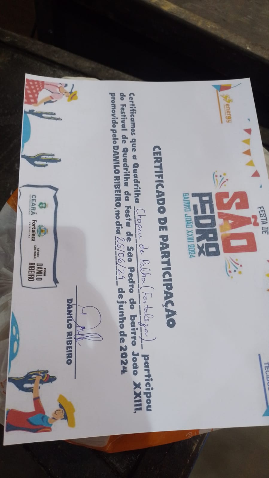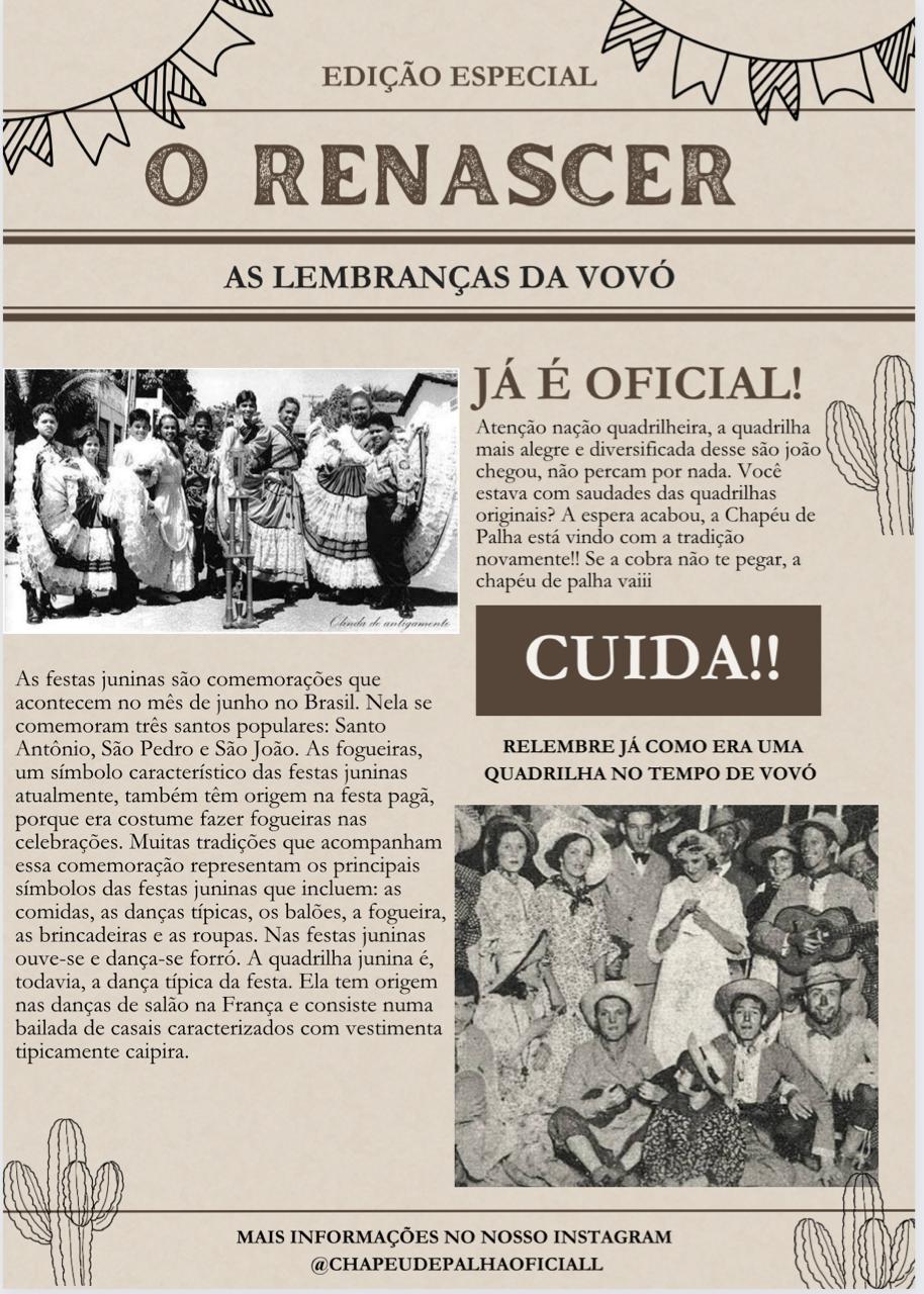 A QUADRILHA CHAPEU DE PALHA É FORMADA POR ADOLESCENTES E JOVENS DA GRANJA LISBOA E BAIRROS VIZINHOS, SENDO UMA RESISTENCIA NO RESGATE DA CULTURA JUNINA NESSA ARÉA DA PERIFERIA DA CIDADE DE FORTALEZA, OS ENSAIOS ACONTECEM DURANTE OS MESES DE JANEIRO A MAIO PARA EM JUNHO E JULHO SEGUIR COM AS APRESENTAÇÕES DA QUADRILHA JUNINA, FORMADA POR 32 BRICANTES.Vídeos