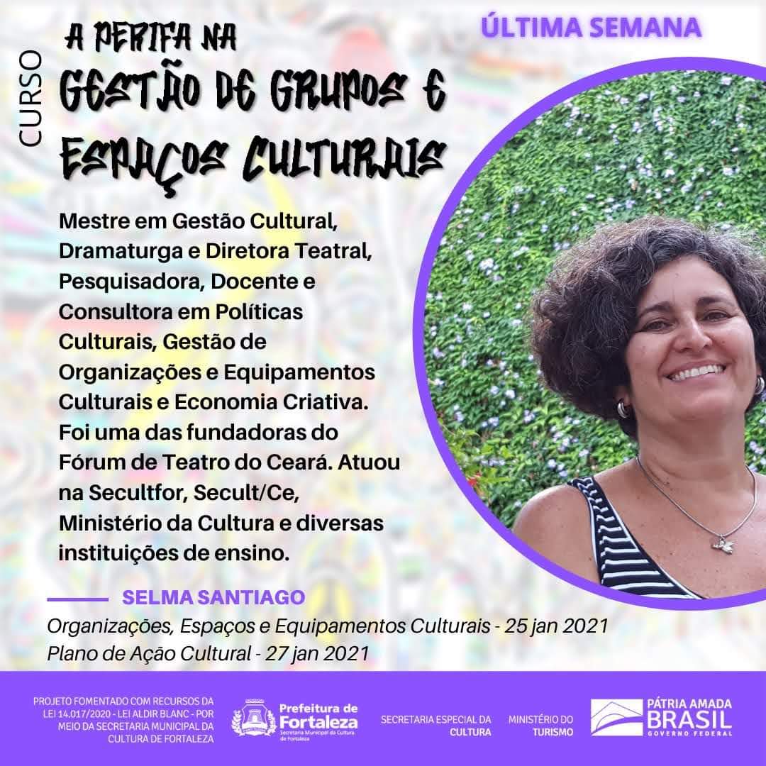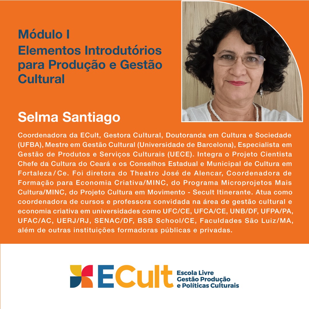 Doutoranda em Cultura e Sociedade/UFBA, Mestre em Gestão Cultural - Universidade de Barcelona, Espec. em Gestão de Produtos e Serviços Culturais - UECE, Bacharel em Sociologia - UNIFOR. Dramaturga e Diretora Teatral - Instituto Dragão do Mar. Coordenadora da ECult - Escola Livre de Gestão, Produção e Políticas Culturais. Integra o Projeto Cientista Chefa da Cultura da Secult/CE e FUNCAP. Foi Coordenadora de Políticas para as Artes da Secult/CE, Diretora do Theatro José de Alencar, professora de gestão cultural , economia criativa e turismo cultural em universidades e outras instituições de ensino. Parecerista de editais para o Distrito Federal, Secretarias de Cultura do Ceará, Fortaleza, Rio de Janeiro, Maranhão, dentre outros. Consultora para Secultfor, BSB Criativo e, através da UNESCO, para o MINC na conceituação e elaboração do Plano Setorial do Artesanato Brasileiro e para a Conceituação e Identificação de Polos Criativos. No Ministério da Cultura coordenou a área de Formação para Competências Criativas da Secretaria de Economia Criativa e o Programa Microprojetos Mais Cultura. Assessora da Secretaria de Cultura do Município de Fortaleza, coordenação do Projeto Cultura em Movimento e o Projeto Secult nos Bairros na Secretaria de Cultura do Estado. No Centro Dragão do Mar de Arte e Cultura, coordenou a área de programação e formação em teatro. No Instituto Dragão do Mar coordenou a área de Gestão Cultural. Por duas vezes presidente da Federação Estadual de Teatro do Ceará, criou o Fórum Estadual de Teatro, integrou a Comissão Nacional de Teatro Contra a Aids. Coordenou Projetos de Teatro Contra a Aids em presídios “Cenas em Celas Abertas” e em escolas do Ceará “Escola Ensina em Cena”. Participou de diversas formas de Festivais, Encontros, Mostras, Seminários, Fóruns e Eventos Culturais no Ceará, tais como Festival Nordestino de Teatro de Guaramiranga e Festival dos Inhamuns – Circo, Bonecos e Artes de Rua, Festival de Teatro Amador de Acopiara, Mostra de Teatro do Maciço de Baturité. Publicou o livro “Gestão Cultural para o Desenvolvimento de Cidades” pela editora Logos3/DF, onde pesquisou a experiência pública na cultura desenvolvida no município de Guaramiranga/CE.Vídeos