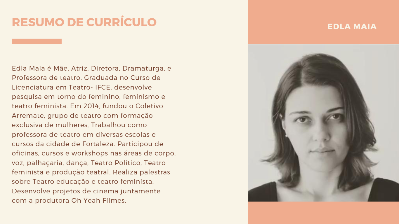 Atriz, Diretora, Dramaturgista, Cenógrafa e Professora de Teatro. Graduada no curso de Licenciatura em teatro - IFCE. Desenvolve pesquisa em torno do teatro feito por mulheres. Atualmente é Mestranda pelo Profissional em Artes do IFCE e professora de teatro na escola Espaço Vida. Em 2014, fundou o Coletivo Arremate, grupo de teatro Feminista na Cidade de Fortaleza-Ce. E em 2020, fundou juntamente com Juliana Tavares, a Coletiva Antonietas, que pesquisa e registra a história de mulheres artistas de teatro do Ceará Realiza palestras sobre filosofia Feminista e Pedagogia Teatral.Vídeos