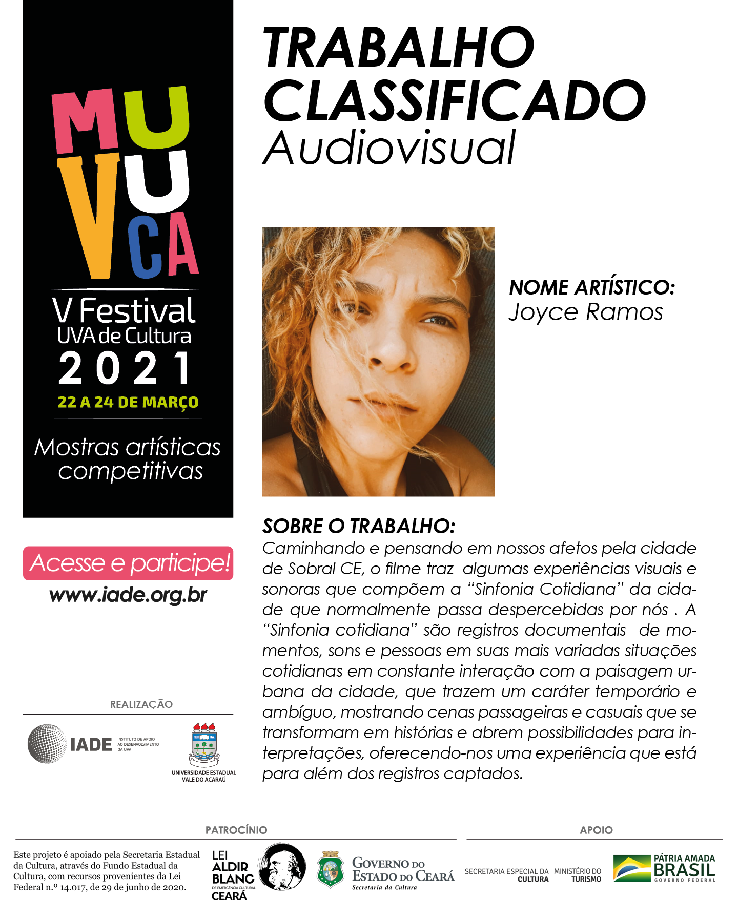 Agente Territorial da Cultura (2024) pelo Ministério da Cultura, artista , pesquisadora , gestora, produtora cultural , e arte-educadora. Atualmente é gestora no Espaço Cultural Quintal de Afetos em Guaraciaba do Norte/CE. É realizadora audiovisual e professora da área de produção audiovisual. Bacharel em Ciências Sociais pela UVA e graduando em Licenciatura em Artes Visuais pela UECE, possui sólida experiência na produção de projetos socioculturais com o Coletivo Cultural Terreiros e Quintais de Afetos .É Coordenadora Pedagógica do Lab.Janelas – Laboratório de Experimentação, Formação e Criação Audiovisual , além de coordenar o Projeto Inventário Participativo das Casas de Farinha de Bananeira e o Ateliê Comunitário de Criação Visual . Idealizadora do CineClube Cinema no Terreiro , desenvolve projetos voltados para as comunidades rurais, com foco em educação, memória, cultura e território, promovendo o acesso democrático à arte e cultura em sua região.