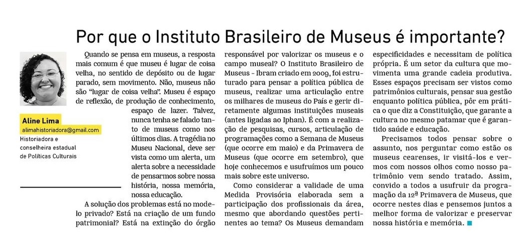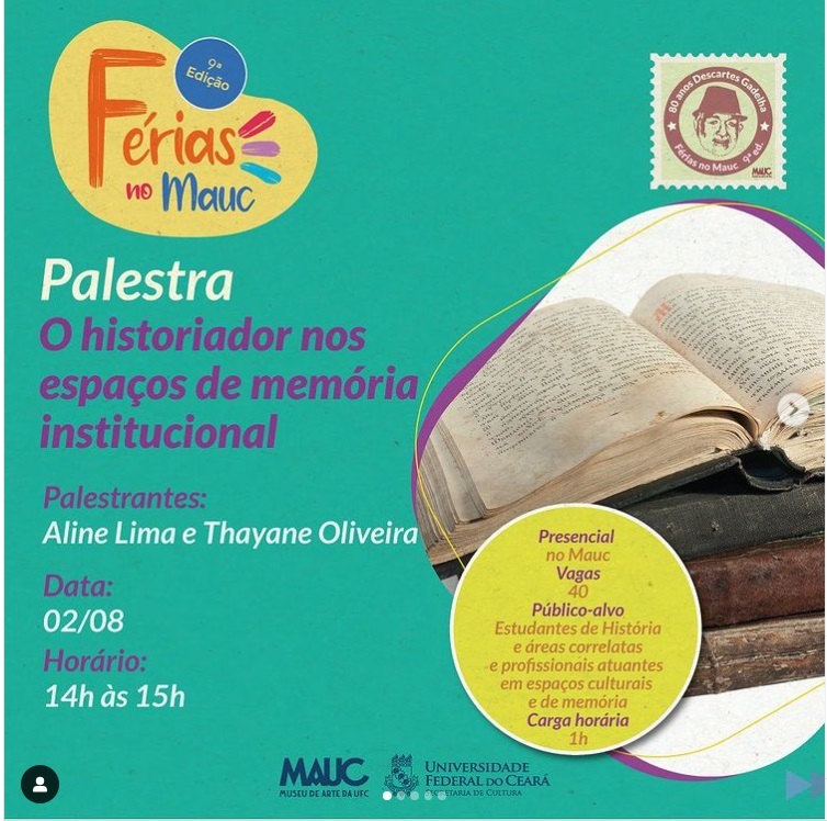 Mestre em História Social pela Universidade Federal do Ceará. Especialista em Gestão Cultural, pela Universidade Federal Rural de Pernambuco em parceria com a Fundação Joaquim Nabuco - FUNDAJ e o Ministério da Cultura. Com experiência nas áreas de: História, com ênfase em História das Ciências, História das Secas e História Social do trabalho; Museus, com atuação no setor de pesquisa para exposições, acervo e na gestão do espaço museológico; e Planejamento e Gestão de projetos no setor cultural, com especial atuação na área de diagnóstico e elaboração de Planos de Cultura, Planejamento Participativo e Educação Patrimonial. Atua como parecerista desde 2015, compondo comissões em editais da Secult – CE, FMAC – AL e Funcultura – PE. Foi eleita conselheira do Conselho Estadual de Políticas Culturais do Ceará, na linguagem Tradições Populares para o biênio 2018-2020.Vídeos