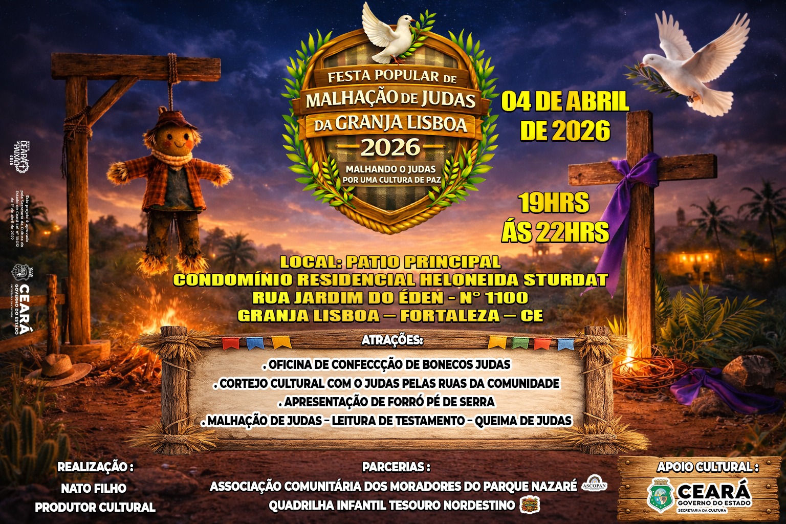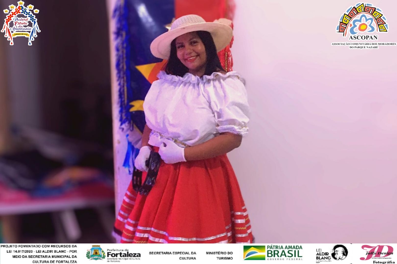 SOU BRINCANTE DO PASTORIL ESTRELA DA ANUNCIAÇÃO DA CIDADE DE FORTALEZA DESDE O ANO DE 2019 ONDE FUI FLORISTA E EM 2020 MESTRA DO CORDÃO ENCARNADO, FUI NOIVA EM 2019 NA QUADRILHA JUNINA NORDESTINA DE FORTALEZA, SENDO VOLUNTARIA NO PROJETO PICIA ONDE AJUDA CRIANÇAS E IDOSOS, 2019 E 2020 TAMBEM FUI BRINCANTE DO REISADO DE COURO COMO PARTICIPAÇÃO ESPECIAL, EM 2008 FUI NOIVA DA QUADRILHA SANFONA DE OURO, 2015 A 2016 FUI NOIVA DA QUADRILHA ARRAIA DO PLANETA.