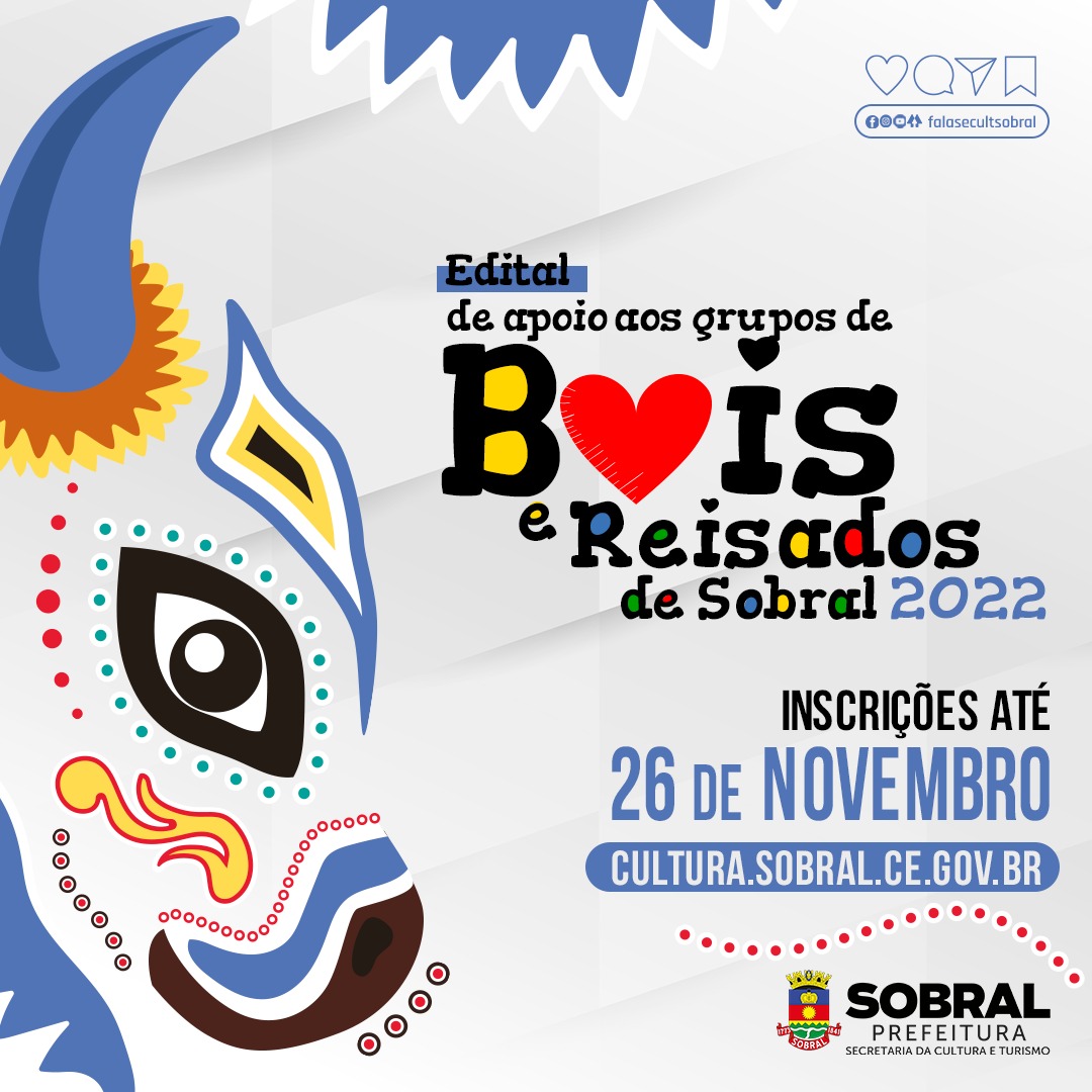 CHAMADA PÚBLICA PARA APOIO E INCENTIVO DA TRADIÇÃO DE GRUPOS DE BOIS E REISADOS DE SOBRAL, cujo objetivo é apoiar grupos que irão se apresentar durante as atividades do ciclo festivo de Bois e Reisados no ano de 2022, em conformidade com o artigo 2º da Lei Municipal n°1.244/2013.