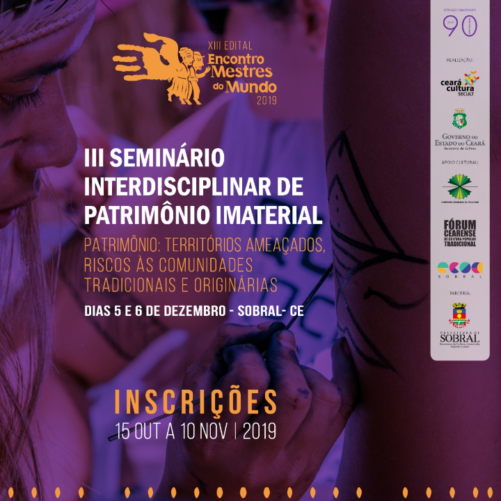 A Secretaria da Cultura, por meio da Coordenadoria do Patrimônio Cultural e Memória – COPAM, em parceria com a Comissão Cearense de Folclore - CCF, torna público a inscrição de trabalhos acadêmicos, escolares ou de pesquisas artísticas sobre Patrimônio Imaterial para participação no III Seminário Interdisciplinar sobre Patrimônio Imaterial sob o tema: “Patrimônio: territórios ameaçados, riscos às comunidades tradicionais e originárias”. Ocorrerá nos dias 05 e 06 de dezembro de 2019, no município de Sobral-CE.