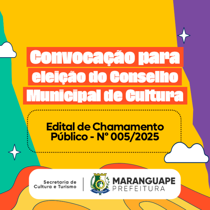 A Secretária de Cultura e Turismo de Maranguape – CE, Adelaide Maria Braga da Silva Prata, no uso de suas atribuições, convoca os agentes culturais e representantes da sociedade civil das áreas de Arte, Cultura e Patrimônio Cultural para participarem da eleição dos representantes da sociedade civil no Conselho Municipal de Cultura – COMCULT, conforme as Leis Municipais nº 3.302/2024, nº 2.245/2010 e suas alterações pela Lei nº 3.376/2025. O presente Edital torna pública a seleção para preenchimento das vagas de conselheiros titulares e suplentes para o biênio 2026-2028.